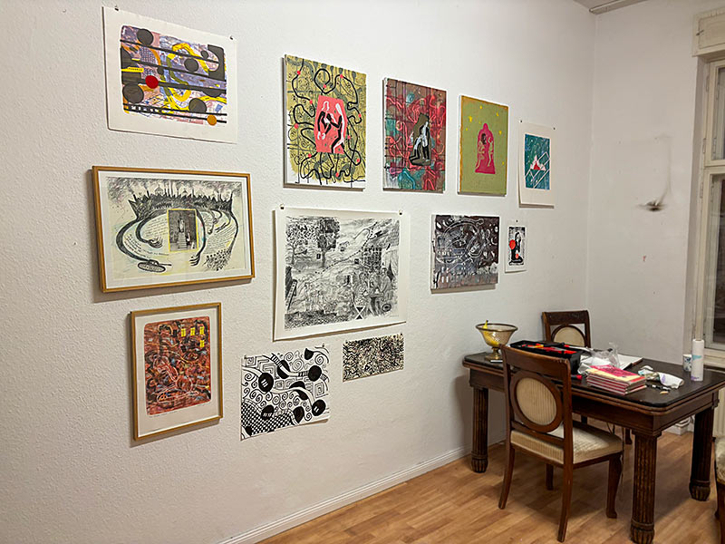 Bilden föreställer min ateljé i Berlin. Jag sitter i stolen och skissar. På väggen syns några av målningarna jag arbetade med just då. Också just denna målning. Genom det stora fönstret kommer ett fint ljus. På himlen syns ofta flygplanen som ska landa på Tegel (nu nerlagt).
