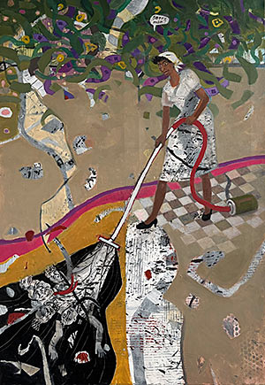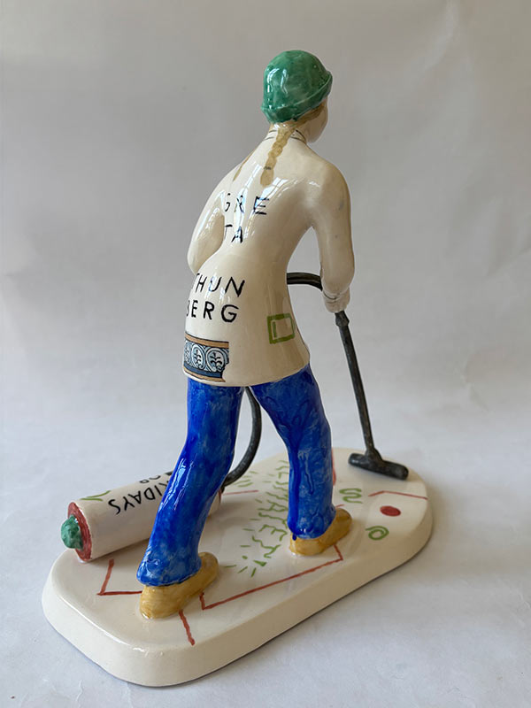 Men i ett patriarkalt samhälle var det männen som gav sig ut på dessa äventyr. Min figur Dammsugerskan vill bryta sig ut från hemmets trånga väggar för att också hon söka sig dessa upplevelser av landskapets skönhet. Därför blir hon Vandrerskan (2014, olja på duk) och har släpat med sig sin dammsugare i klättringen upp till bergets topp. Här öppnar sig världen för henne och nu ser även hon hur stor den är. Och så tänker hon: