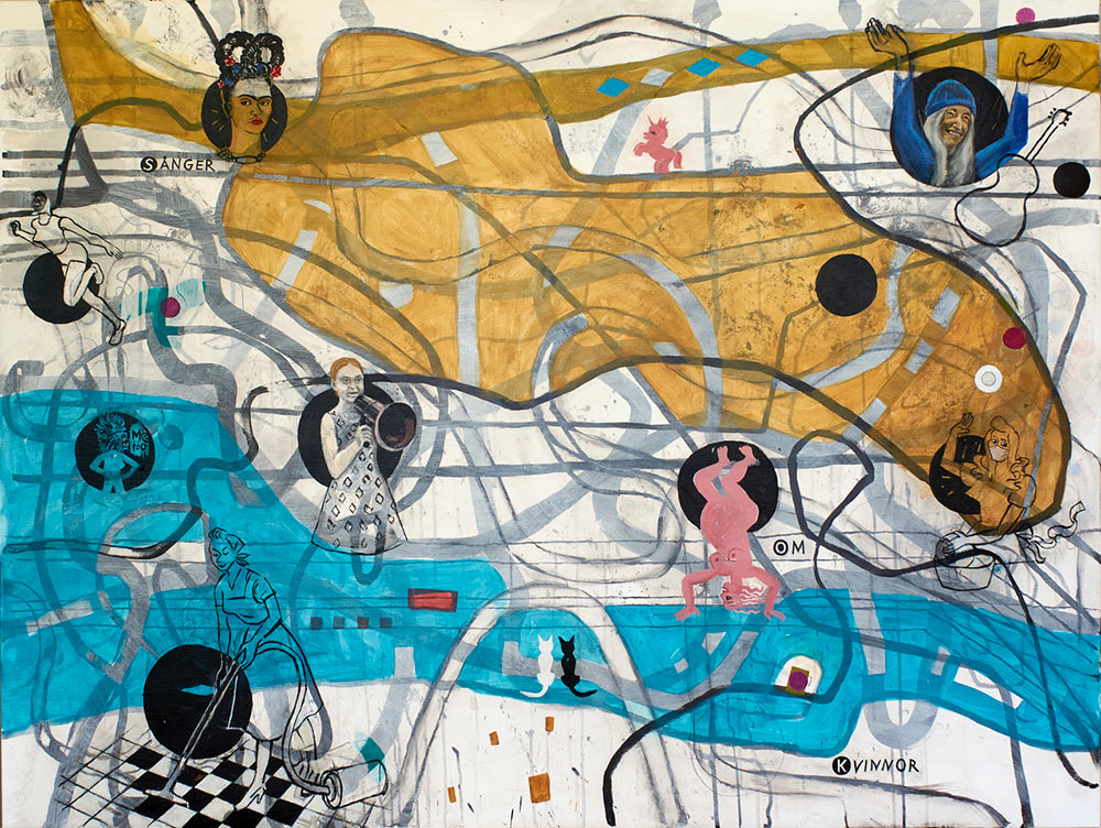 Målningen Sånger om kvinnor, 2020, akryl på duk, 163 x 123 cm, av Gittan Jönsson utgår ifrån ett LP-omslag hon gjorde till skivan Sånger om kvinnor, utgiven på MNW 1971.